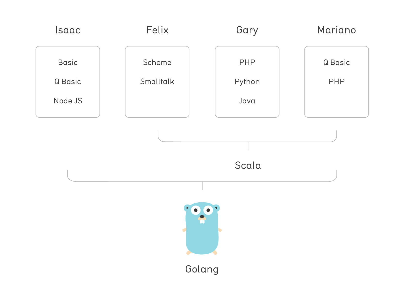 What made Scala so attractive? This can easily be explained if you consider our backgrounds. Here’s the succession of favorite languages over time for some of us: